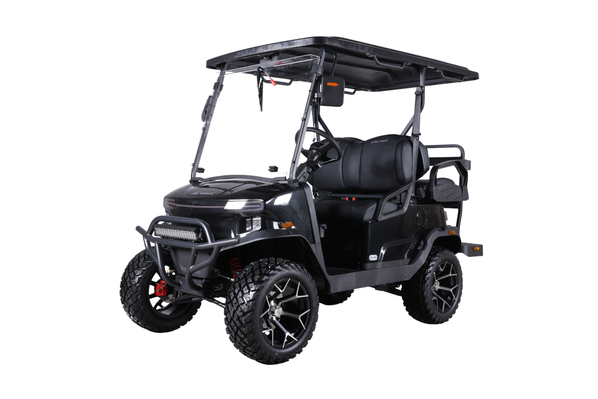 Seating for four with cushioned upholstery, 3‑point seat belts, seat‑back cupholders, and grab bars ensure every ride is secure and stylish. The full LED street‑legal lighting package includes headlights, brake lights, turn indicators, fog lights, and horn.